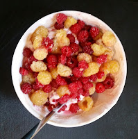 Köpte hallon häromdagen på Ica till extrapris, 20kr/125 gram och de var inte alls goda utan sura. Hade nog glömt bort mina egna vildhallon, både röda och gula, söta och goda. I morse drog jag på mig stövlarna och plockade 225 gram på några minuter och de smakar så gott. Stövlar tog jag på dels för att det är så blött av daggen i det höga gräset utanför tomten, dels vill jag undvika att få fästingar på mig.