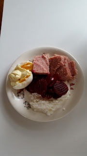 Till lunch åt jag kalvsylta, keso, inlagda rödbetor, kokt ägg med majonnäs och till kvällsmat frossade jag loss på en liter jordgubbar med vispad grädde, mums. Jag åt en bit brie tillsammans med några Kalamataoliver lite senare, inte för att jag var hungrig, men för att få till en bra E%.