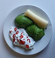 Funderade på vägen hem vad jag var sugen på till kvällsmat och som kunde kompensera upp tårtan och chokladen jag stoppat i mig för att det inte skulle bli alldeles galet många kolhydrater i förhållande till proteiner och fett. Det blev till slut en avokado, turkisk yoghurt med mosad ädelost, en skiva Maasdamerost och lite röd chili. Gott och mättande!