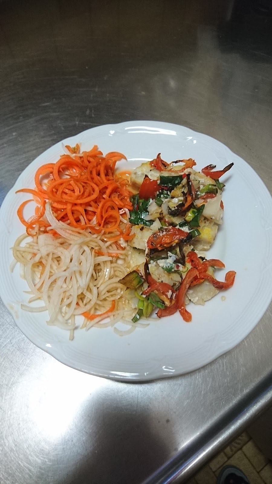 Naturligtvis var jag ju tvungen att prova den nya grönsakssvarven när jag kom hem och svarvade till både morot och rättika. Blodvite uppstod då jag körde ett finger rakt emot piggarna på svarven, den är oerhört vass! Jag körde in lite torsk i ugnen med tomat och purjolök och åt det tillsammans med det jag hade svarvat, det smakade finfint.