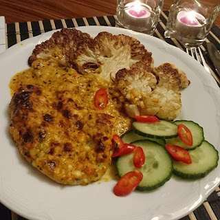 Till middagen gjorde jag en "hitte-på"-rätt som blev otroligt lyckad och jag åt den med rostad blomkål. Jag blandade keso, creme fraiche, basilika, parmesan, stark Ajvar relish och pressad vitlök och bredde det över kycklingfiléerna som jag lagt i en smord form och kryddat med örtsalt och peppar. Alltihopa fick gå i ugnen på 175° i cirka 35 minuter. (Jag hade skurit filéerna och fläkt ut dem så det blev tunnare och snabbare färdiga, finns ju även färdiga tunnskivade att köpa). Fullständigt recept lägger jag in på receptsidan här.